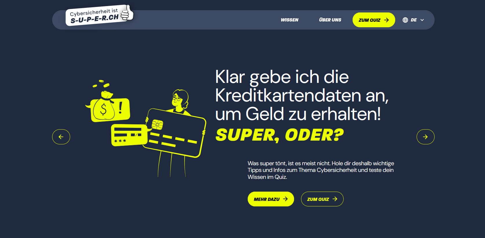 Auf der Kampagnenseite S-U-P-E-R.ch finden sich verschiedene Informationen rund um das Thema Cybersicherheit – sowohl für Privatpersonen als auch für Unternehmen. Zudem stehen auf der Website Quiz in drei Schwierigkeitsstufen zur Verfügung, um das eigene Cybersicherheitswissen zu prüfen.